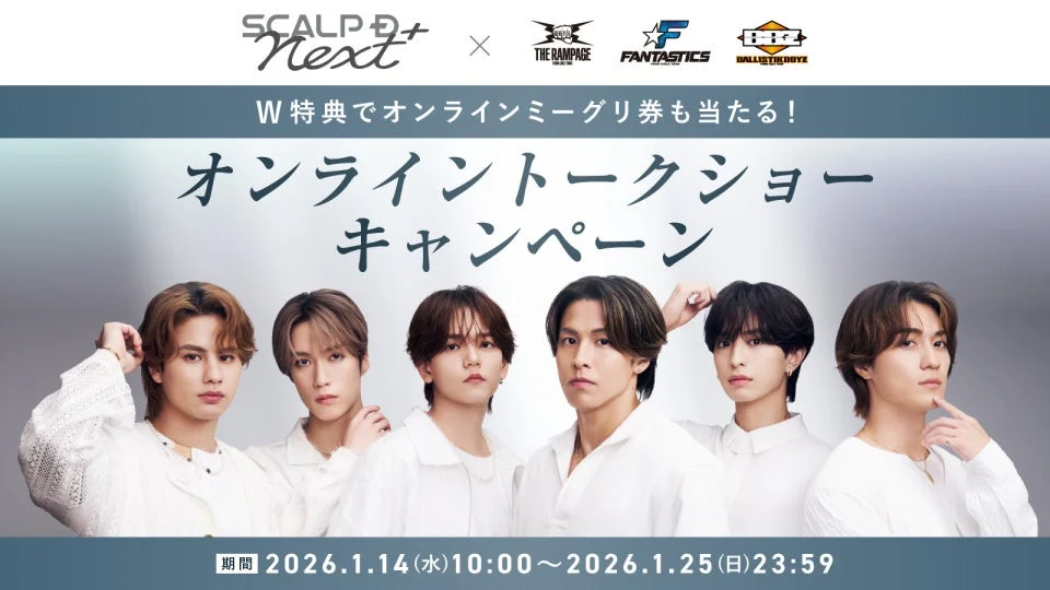 SCALP D Next × THE RAMPAGE FANTASTICS BALLISTIK BOYZ W特典でオンラインミーグリ券も当たる! オンライントークショー キャンペーン 期間 2026.1.14(水)10:00~2026.1.25(日)23:59