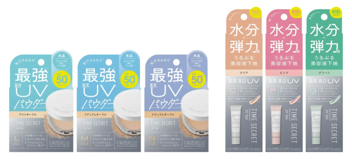 La industria cosmética está llena de opciones, y elegir el producto adecuado puede ser un desafío. Por eso, Time Secret ha rediseñado sus empaques para que sus características sean claras a primera vista. Mensajes clave como “Polvo UV más potente” y “Hidratación + Elasticidad” se destacan audazmente en el frente del empaque, comunicando los beneficios de forma directa. Además, el uso de detalles plateados en la parte inferior transmite la fiabilidad de un producto cuasi-medicinal (cosmecéutico) y su alta funcionalidad.