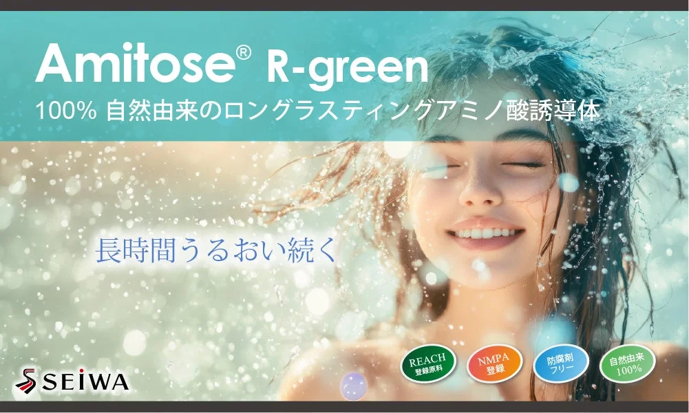 A partir de abril de 2026, Seiwa Kasei lanzará al mercado Amitose® R-green, un nuevo derivado de aminoácido 100% natural diseñado para ofrecer una “hidratación de larga duración”. Este ingrediente es el resultado de la fusión de glicerina y arginina, dos componentes conocidos por sus excelentes propiedades hidratantes.