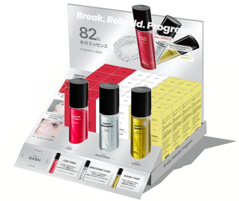 - GASH T.P Toner (TARGETED PORE): Este tónico ofrece un enfoque 5D para tensar la piel, refinar su textura y proporcionar elasticidad a los poros que lucen secos.