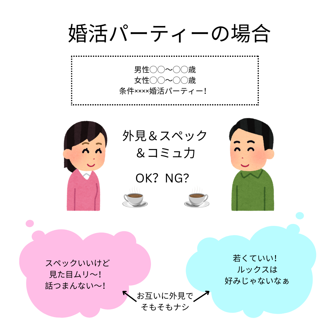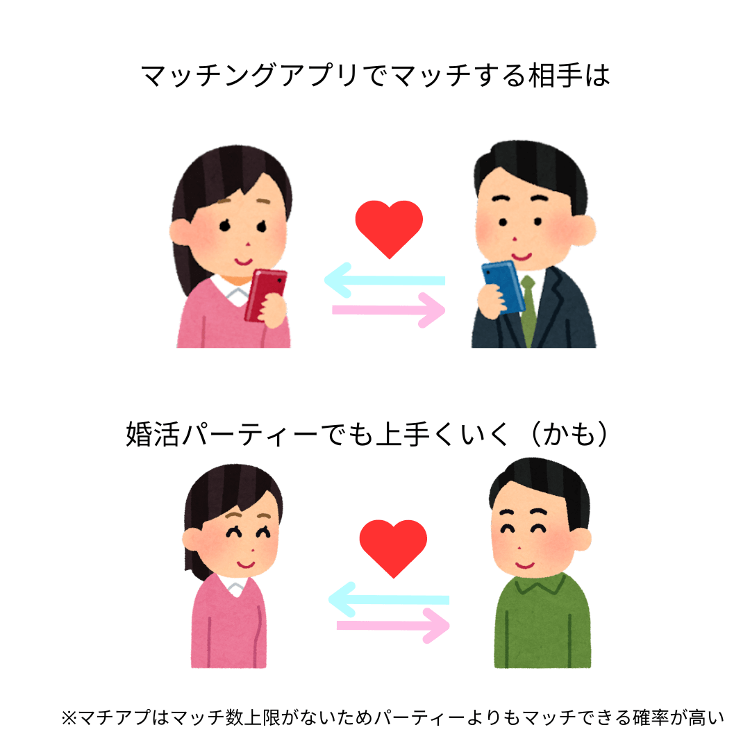婚活パーティーは会場まで訪れて、その場でマッチングアプリをしているようなものというわけです。