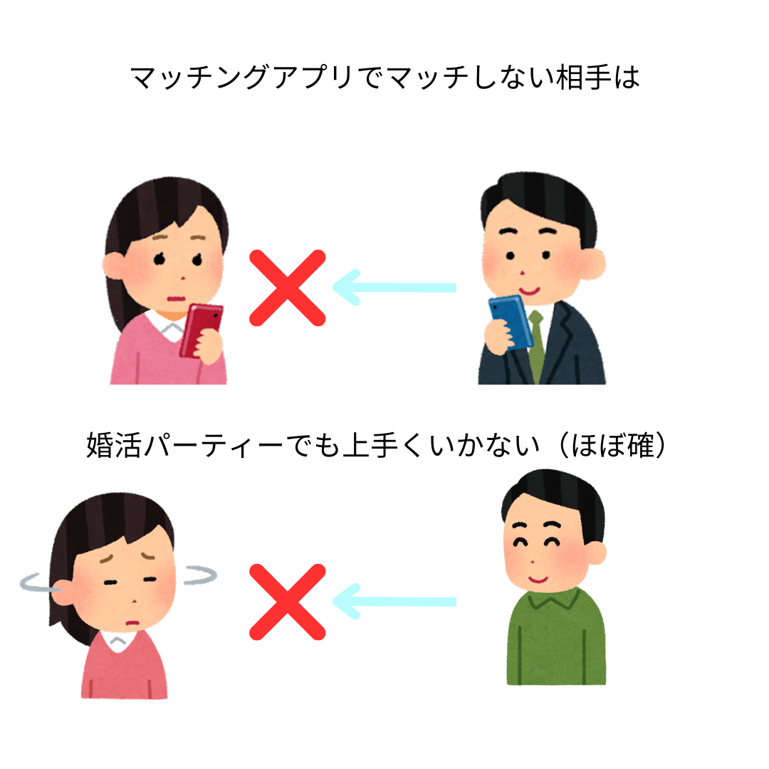 婚活パーティーならマッチングアプリで「いいね」を返してくれないような異性と出会える!という思想だそうですが、その異性は結局あなたに「いいね」を返してくれない異性です。