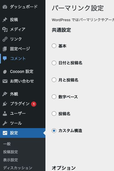 設定>パーマリンク を開き、ページ下部を確認。